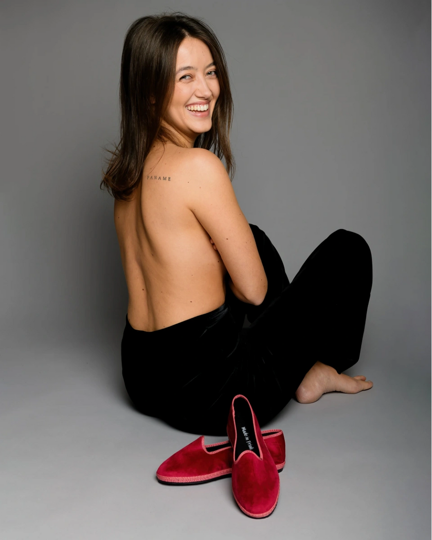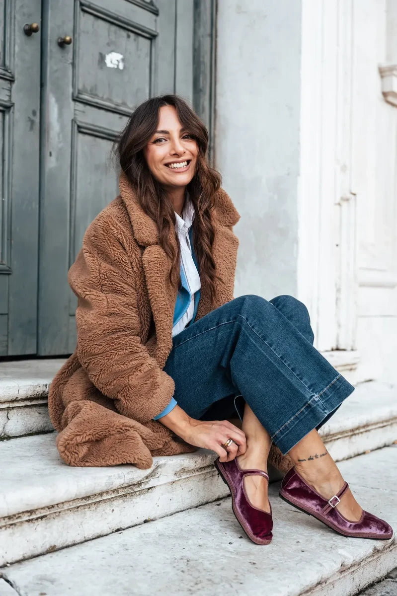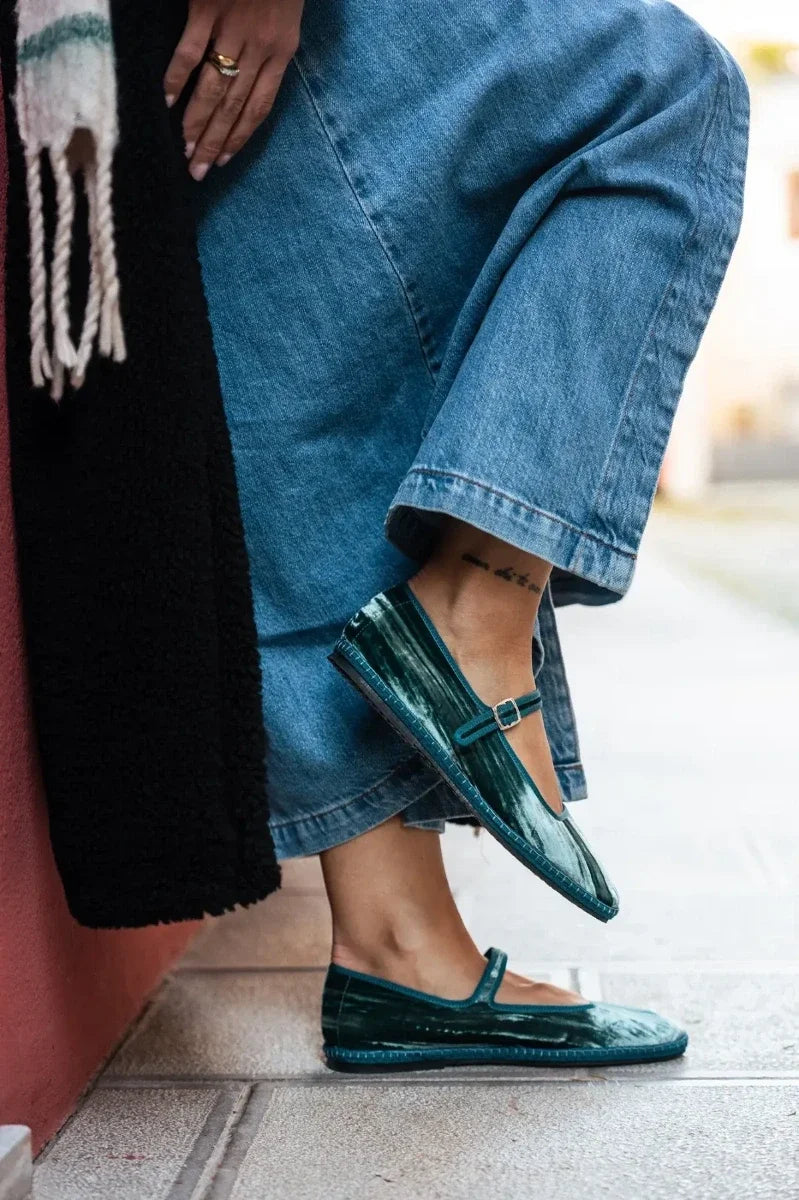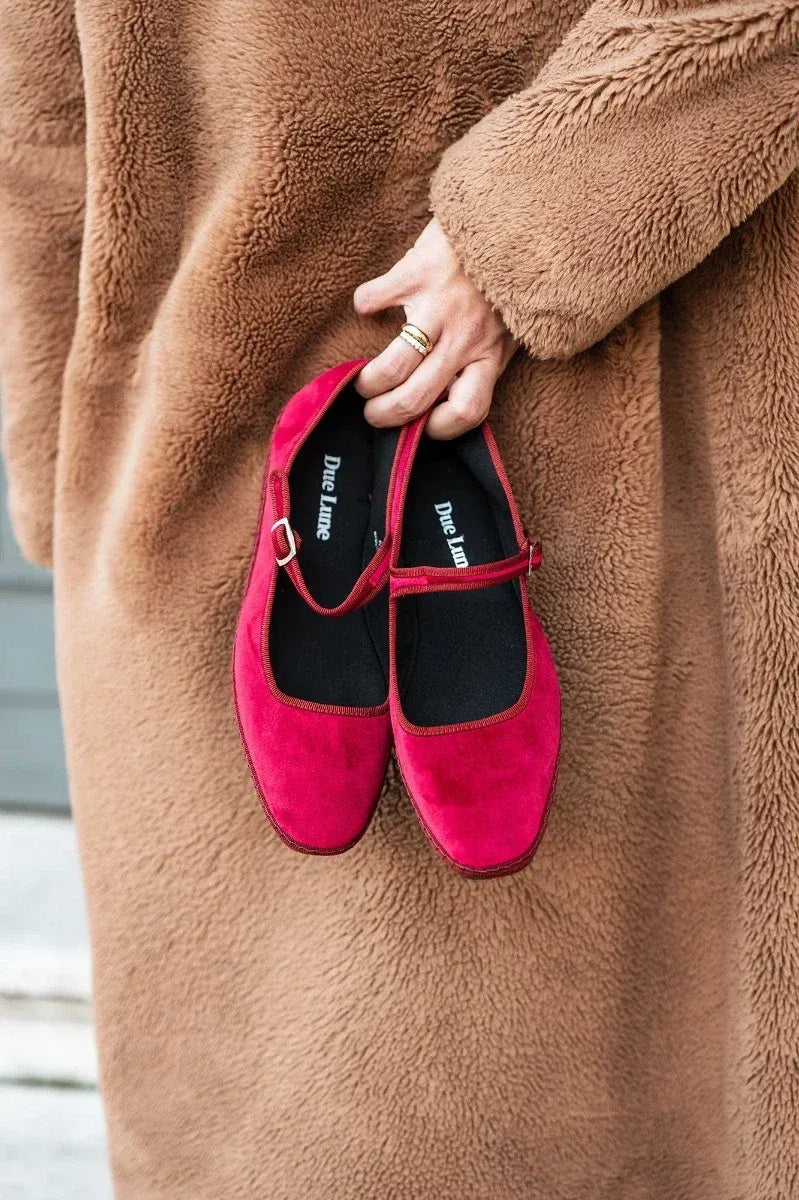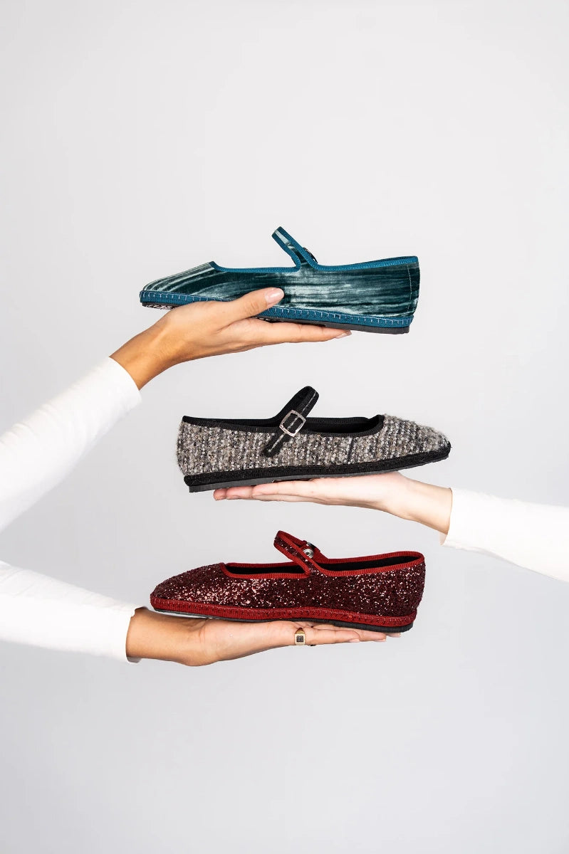 The Diva in Wine Glitter is an Italian Mary Jane flat in deep ruby glitter fabric.